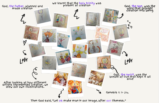 We looked at how a selection of artists portrayed the creation story before we made our own image of creation. Can you see the three parts of God in our images?